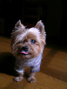 暑い夏でも早朝は涼しくて気持ちいいです。 momoは親が飼っているヨーキーでした。 親の家に行くとkeishiくん散歩には行けないので、momoはkeishiくんのピンチヒッターでした。 でも、このごろは親の家にいることが多くて、「散歩で ワン!」はmomoのページのようにもなっていました。 いつも食欲旺盛で、食い意地がはっていたmomoが11月7日の朝はドッグフードをすぐには食べませんでした。 それでも、その日もいつものように散歩に行きました。 最初に様子がおかしくなったのはその夕方です。 呼吸が速くて、お腹が大きく動いていたので、すぐにいつもかかっている病院まで連れて行きました。 注射して、薬をもらって、それからは呼吸もその時ほど荒くなることもなく、 調子の悪そうな時もあれば、元気に過ごしている時もありました。 先週初めにも車に乗せて病院まで薬をもらいに行きました。 気管支拡張剤の注射をしてもらったら翌日は本当に元気で、いつものmomoに戻ったかのように思えたくらいでした。 親から、momoの様子がおかしいと電話があったのは29日の夜でした。 動物病院の診察時間には間に合わなくて先生に電話をしたら、翌日に早く連れてきてくださいと言われました。 その夜は何回も何回も何回もmomoの夢を見ました。7-8回、momoの夢を見たと思います。 夢に出てくるmomoはいつも元気で、「あー、よかった。元気になったんだ」と思ったら夢から覚めて、 あぁ、夢だったのだとがっかりしました。 その日の明け方にmomoは旅立ちました。 病院へ連れて行こうと移動している時に訃報が届きました。 momoは旅立つ前に、私に会いにきたのだと思います。 だって、今までにあんなにmomoの夢を続けて何回も見たことはないもの。 自己主張が強かったmomo。 食いしん坊momoは野菜や果物が大好きで、林檎、人参、胡瓜の他、獅子唐やスナップエンドウも大好き、苦瓜も生でポリポリ食べました。 ぴーんと両耳を立てて散歩していたmomo。 他の犬が来ても、いつも知らんぷりしていたmomo。 しょっちゅう粗相をしていたmomo。 momoとはいろんなところへ行きました。富士山を見に行ったり、湘南の海へ行ったり(波が来ると、怖がって逃げました)、 伊豆で潜る時にも連れて行きました。軽井沢にある会社の保養施設では夜にこっそり連れて入っていっしょに寝たし、 飛行機に乗って八丈島にも行きました。 16年間momoといっしょで楽しいことがたくさんありました。 momoといっしょに過ごせた私は幸せです。 (2005年12月1日記) |