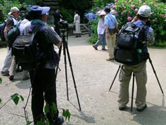 開け放たれた本堂から、仏像たちが寺の庭を眺めているようなお寺です。 このお寺がにぎわうのは紫陽花の頃、紅葉の頃。 それ以外の季節は静かなお寺で、本堂の広い縁側に座っていると、森の空気に包まれて、 何とも言えず、ほっとする気分になります。 一度、男性参拝客が縁側で柱にもたれて、うたた寝していたこともあります。 今年も紫陽花の頃にお詣りに行きました。 梅雨の中休みで晴れて暑い日だったので、暑くなる前にと、拝観が始まってまもない朝に行きました。 着いてすぐ本堂に上がり、住職さんに「今年も紫陽花の時期にお詣りに来ることができました」と しばらく話した後、お詣りして、カメラを出して紫陽花を撮り始めました。 すると間もなく、20名ほどの年配カメラマングループがやってきて、到着するなり全員ぱたぱたと カメラと三脚を取り出して、狭い境内は三脚だらけになりました。 去年の紫陽花の頃も、写真家グループといっしょになりましたが、皆さん穏やかな気のいい方たちで、 いろんな話をしながら静かに写真を撮りましたが、今年のこのグループは違いました。 「あんた達、本尊さんにお詣りもしないで紫陽花撮ってるの? そういう私もお詣りしてないけどねぇ」 とグループの1人は本堂の前で大声で話していました。 すぐそばの本堂に座っていらした住職さんにはまる聞こえだったはずです。